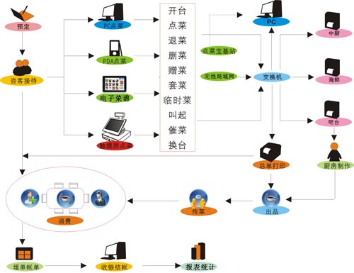 點菜操作:點菜、退菜、口味做法、套菜、換菜、贈送、臨時菜、贈送、推銷員、定折、一菜多吃、催菜、等叫、叫起、菜品轉(zhuǎn)臺、稱重、沽清